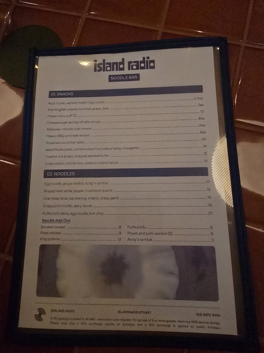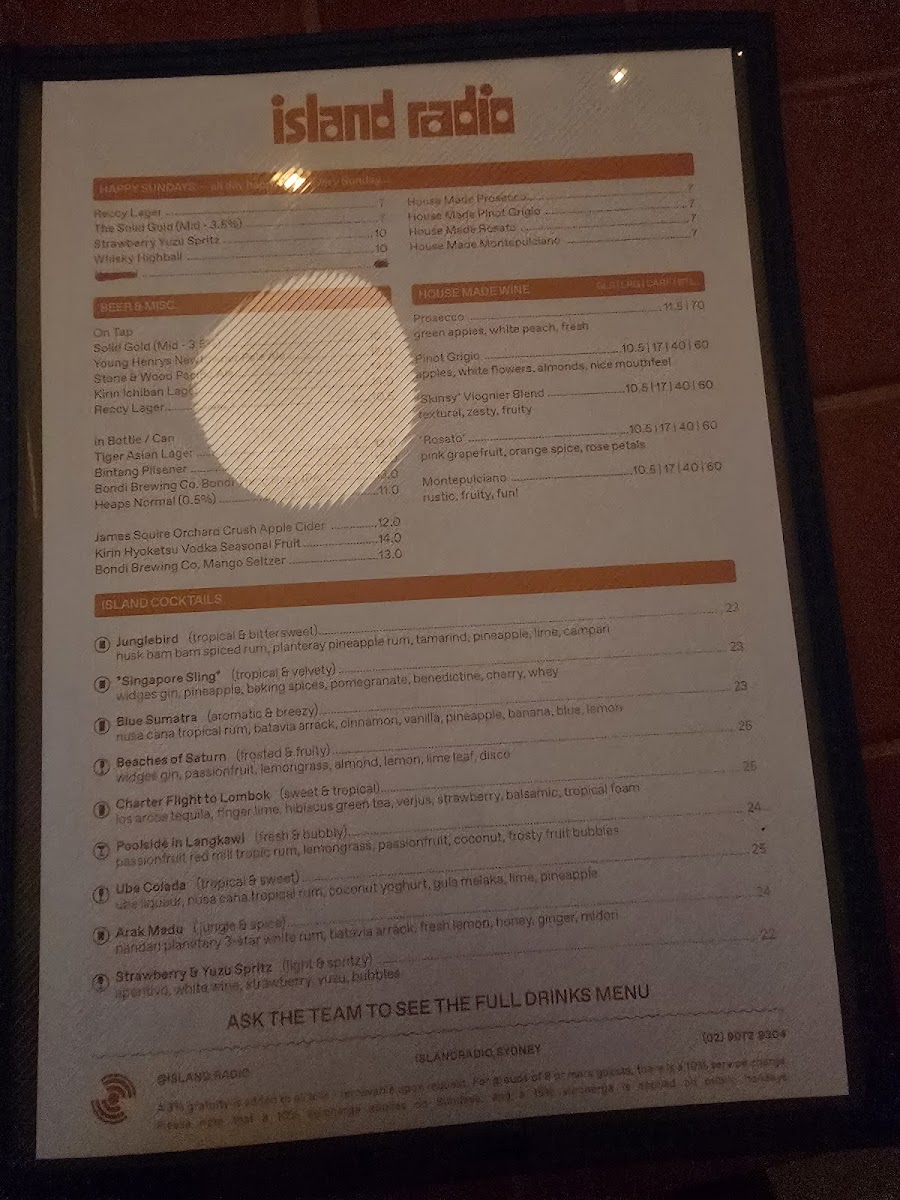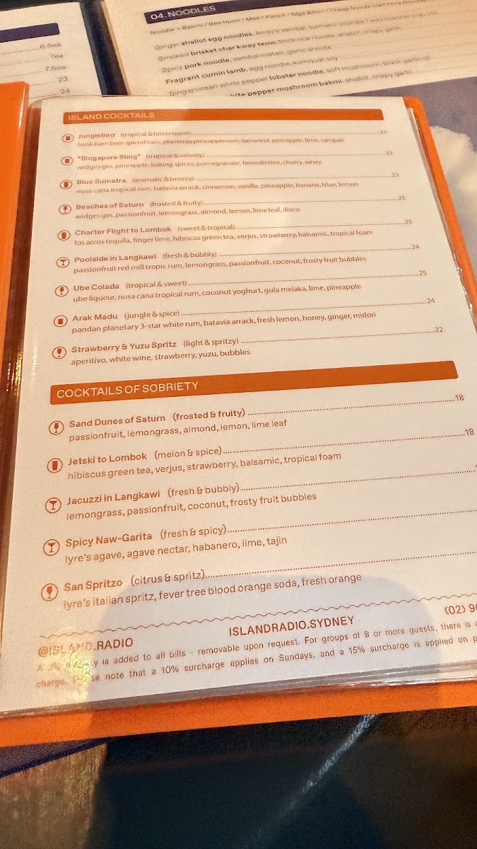 Island Radio’s menu is a vibrant mix that balances playful creativity with bold flavors. For starters, the Rock Oyster, Sambal Matah Mignonette and Raw Kingfish Skewer, Coconut, Grape, Lime provide a fresh, elegant introduction, while the Potato Curry Puff and Cheeseburger Spring Roll Lettuce Cup add a comforting, inventive twist. The Malaysian Chicken Sate Skewer stands out as a crowd-pleaser with its rich, spiced marinade. Noodle lovers can enjoy the Egg Noodle, Ginger Shallot, Andy's Sambal or the Singaporean White Pepper Mushroom Bakmi, both offering depth of flavor and satisfying textures. Drinks are equally enticing, from the playful Whisky Highball in the Happy Sundays selection to the crisp Solid Gold, Young Henrys New, and Reccy Lager on tap. House-made wines like Prosecco, Pinot Grigio, and the Skinsy Viognier BlendMontepulciano bring sophistication, while Island-themed cocktails such as Junglebird, Blue Sumatra, and Beaches Of Saturn promise a tropical escape. For those avoiding alcohol, the Cocktails Of Sobriety-including Sand Dunes Of Saturn, Jetski To Lombok, and Jacuzzi In Langkawi-offer complex, refreshing alternatives. Light bites like the Prawn And Pork Wonton and condiments such as Andy’s Sambal complement the beverages perfectly, rounding out a menu that is both inventive and approachable. Overall, Island Radio delivers a menu that encourages exploration, pairing playful flavors with high-quality ingredients, all while maintaining an accessible, fun dining experience.