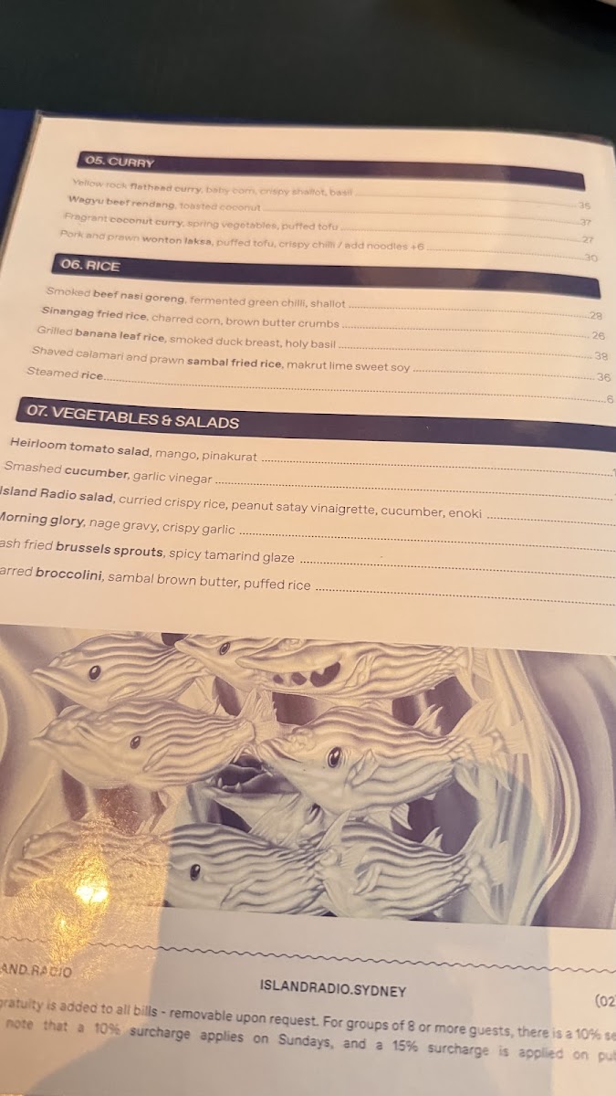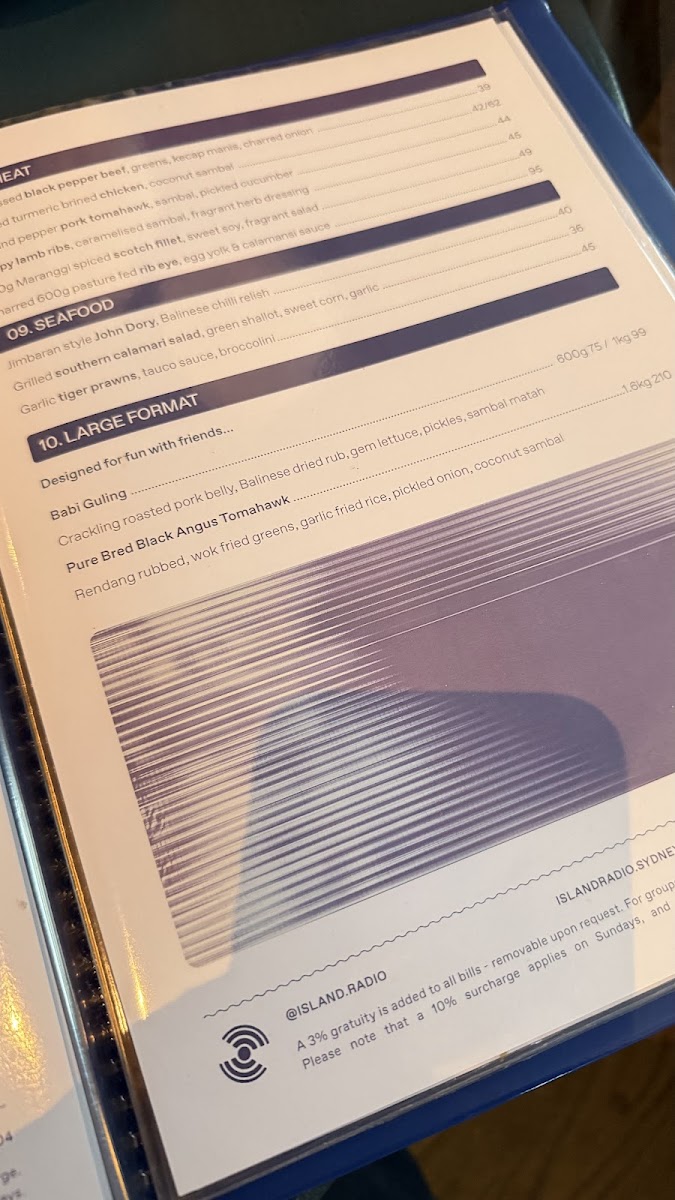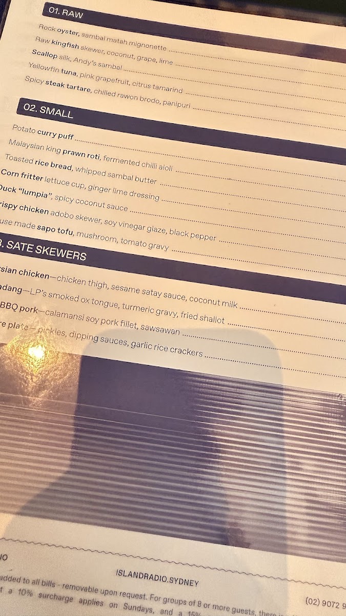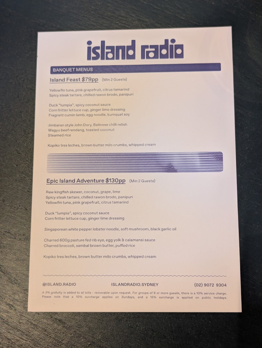 Island Radio’s menu is a vibrant mix that balances playful creativity with bold flavors. For starters, the Rock Oyster, Sambal Matah Mignonette and Raw Kingfish Skewer, Coconut, Grape, Lime provide a fresh, elegant introduction, while the Potato Curry Puff and Cheeseburger Spring Roll Lettuce Cup add a comforting, inventive twist. The Malaysian Chicken Sate Skewer stands out as a crowd-pleaser with its rich, spiced marinade. Noodle lovers can enjoy the Egg Noodle, Ginger Shallot, Andy's Sambal or the Singaporean White Pepper Mushroom Bakmi, both offering depth of flavor and satisfying textures. Drinks are equally enticing, from the playful Whisky Highball in the Happy Sundays selection to the crisp Solid Gold, Young Henrys New, and Reccy Lager on tap. House-made wines like Prosecco, Pinot Grigio, and the Skinsy Viognier BlendMontepulciano bring sophistication, while Island-themed cocktails such as Junglebird, Blue Sumatra, and Beaches Of Saturn promise a tropical escape. For those avoiding alcohol, the Cocktails Of Sobriety-including Sand Dunes Of Saturn, Jetski To Lombok, and Jacuzzi In Langkawi-offer complex, refreshing alternatives. Light bites like the Prawn And Pork Wonton and condiments such as Andy’s Sambal complement the beverages perfectly, rounding out a menu that is both inventive and approachable. Overall, Island Radio delivers a menu that encourages exploration, pairing playful flavors with high-quality ingredients, all while maintaining an accessible, fun dining experience.
